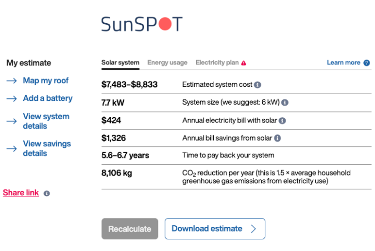 After putting in the address and answering some simple questions about their electricity usage, SunSPOT presents the Browns with a suggested system size that will give the best return on investment (based on their current electricity use) – 6kW (six kilowatts)